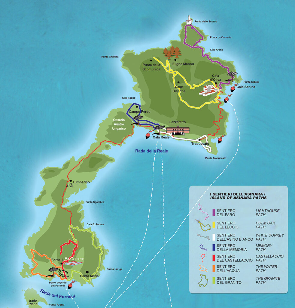 L’Asinara è un’isola del mar Mediterraneo, situata a nord ovest della Sardegna e fa parte del comune di Porto Torres, in provincia di Sassari, è la quinta isola italiana per estensione (escludendo Sicilia e Sardegna) e la terza sarda, dopo Sant’Antioco e San Pietro. Ha carattere prevalentemente collinare con poche zone pianeggianti come la piana di Campu Perdu e la piana di Fornelli. La conformazione costiera è varia nella parte occidentale, è alta e frastagliata, nella parte orientale più bassa con l’interruzione di alcune spiagge. L’isola dell’Asinara è sede dell’omonimo parco nazionale dal 3 ottobre 2002. Il clima dell’isola è quello tipico mediterraneo, con inverni miti ed estati calde. La flora è costituita da quasi 700 specie con limitata copertura vegetale a macchia mediterranea con una piccola parte di formazioni boschive di leccio. Ricchissima di avifauna e di ittiofauna. La fauna dell’Asinara ha trovato il giusto habitat dove vivere e riprodursi, infatti il Parco conta circa 80 specie, molte delle quali di assoluta rarità come i famosi asinelli bianchi, che vivono allo stato brado e sono presenti sull’isola fin dall’antichità, infatti già nel XII sec. veniva chiamata “isola madre degli asini”. Altri animali presenti sono il cinghiale, la lepre, il cavallo, la donnola, il muflone etc. L’Asinara inoltre fa parte da tempo del cosiddetto “Santuario dei cetacei” classificato come Area Specialmente Protetta di Interesse Mediterraneo. I cetacei che percorrono periodicamente quest’area sono: balenottera, capodoglio, delfino comune, stenella, tursiope, globicefalo, zinfio e grampo. Durante la navigazione in barca è facile avvistare meravigliosi delfini.